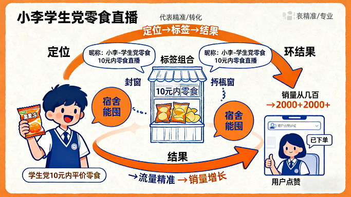 举个完整例子:大学生小李,一开始啥零食都卖,没定位没标签,销量差;后来调整: