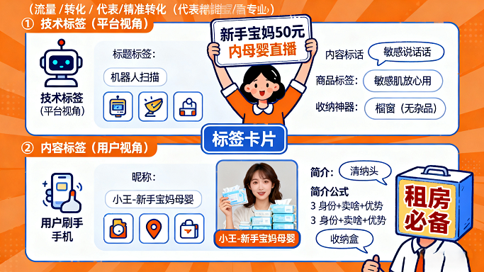 定位是 “内核”,标签是 “外显”,两者要配合,才能让用户 “找得到、愿意买”,平台 “推得准、给得多”。比如你定位 “租房党小空间收纳直播”,标签就要围绕这个定位做: